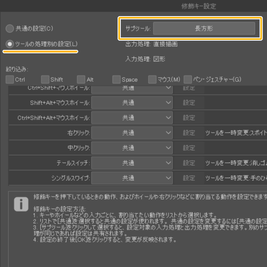 「修飾キー設定」の画面が表示さましたら、まず画面に左上で「共通の設定」か「ツールの処理別の設定」かを選びましょう。