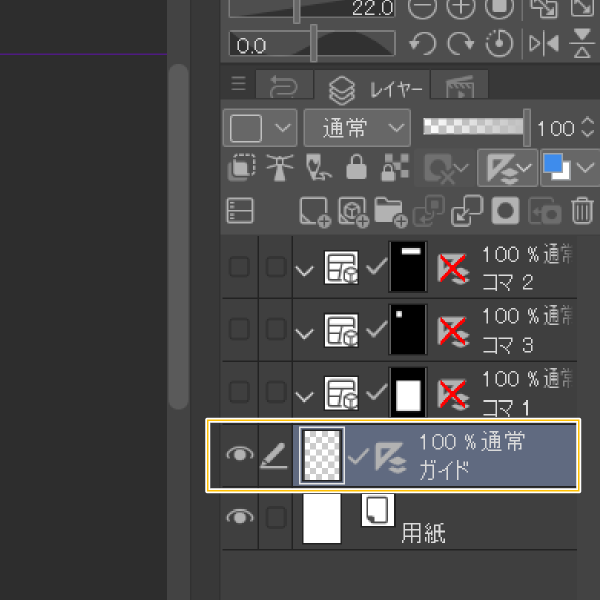 ガイド線を出すとレイヤーパレットにガイドの定規が付いたレイヤーも作成されます。